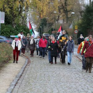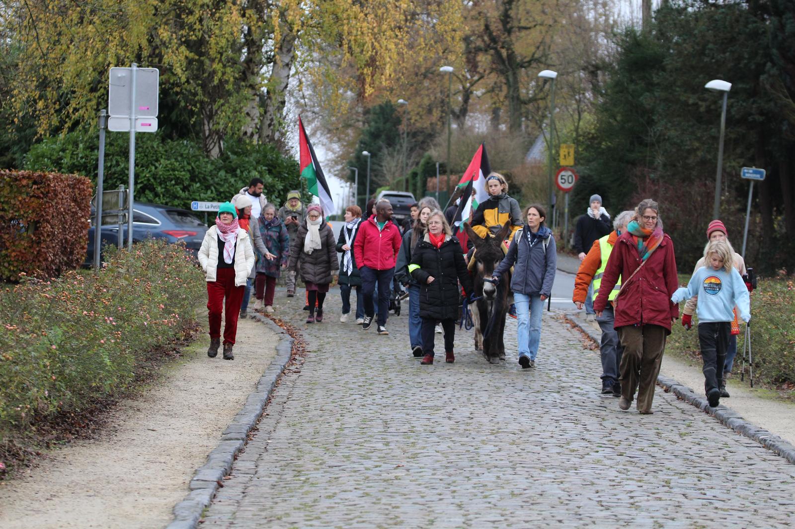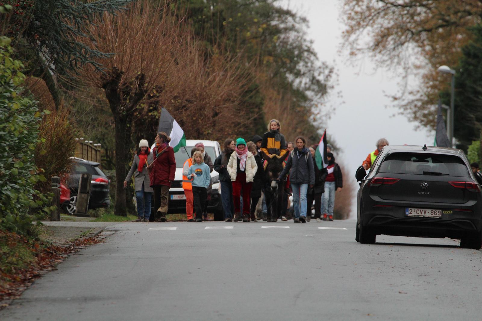 Accompagné•e•s de deux ânes, une trentaine de Chastrois•es se sont réuni•e•s sur le chemin de la maison communale dans la bonne humeur. À notre collectif, se sont ajouté•e•s d’autres citoyen•ne•s dont les familles palestiniennes chastroises.